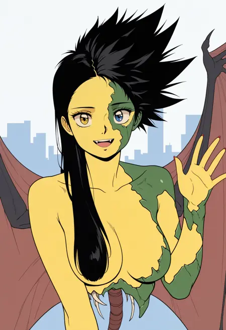 Custom outfit: mnngl, black hair, asymmetrical hair, spiked hair, long hair, monster girl, multicolored skin, yellow skin, green skin, heterochromia, blue eyes, yellow eyes, red lips, bat wings