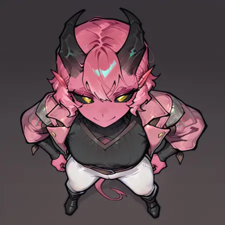 Example prompt: dndt0ken, top down view, from above, 1girl, brown skin, black hair, red eyes, white background, standing