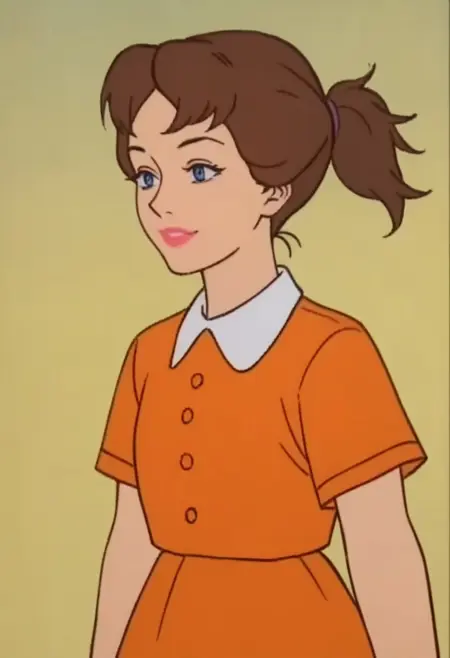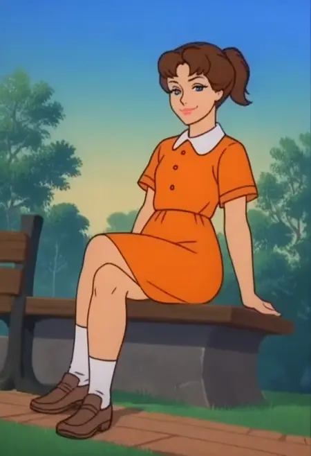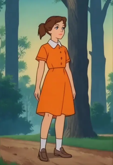 CWFern, 1girl, brown hair, ponytail, short sleeves, dress, orange dress, shoes, socks, blue eyes, short hair, shirt, brown footwear, orange shirt, lipstick, makeup, orange skirt