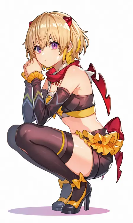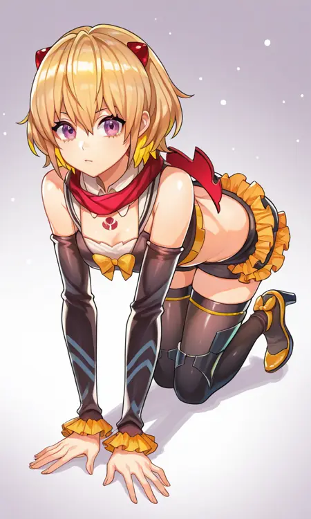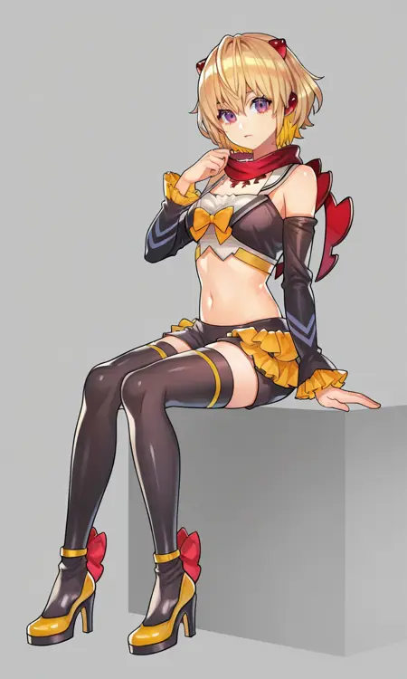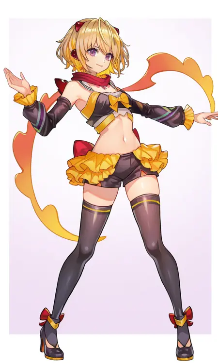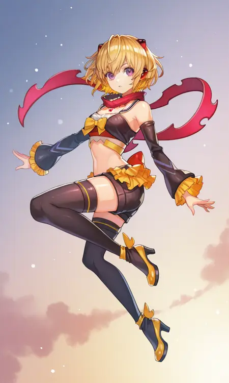 CyanSarutobiIL,1girl,purple eyes,yellow hair,short hair,hair ornaments,scarf,