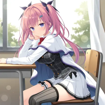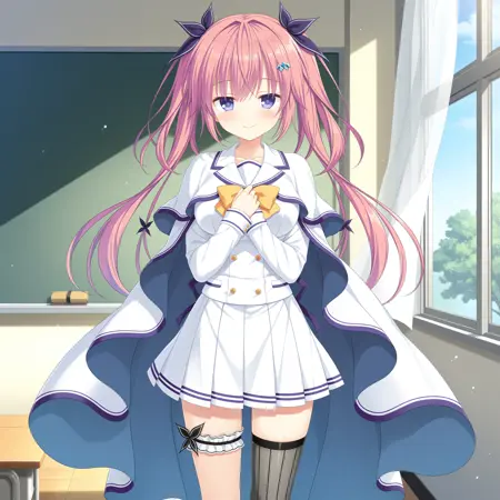 twintails,hairclip,hair ribbon,school uniform,pleated skirt,long sleeves,white skirt,miniskirt,white shirt,collared shirt,white sailor collar,yellow bowtie,waist ribbon,purple ribbon,thigh strap,vertical-striped thighhighs,single thighhigh,grey thighhighs,