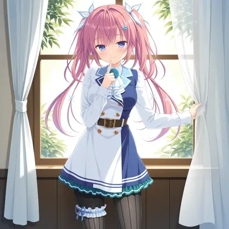 twintails,hair ribbon,hairclip,ascot,neck flower,blue rose,long sleeves,white shirt,black pantyhose,suspender skirt,high-waist skirt,white bow,blue skirt,bridal garter,white ribbon,center frills,grey thighhighs,uneven legwear,thigh strap,vertical-striped thighhighs,