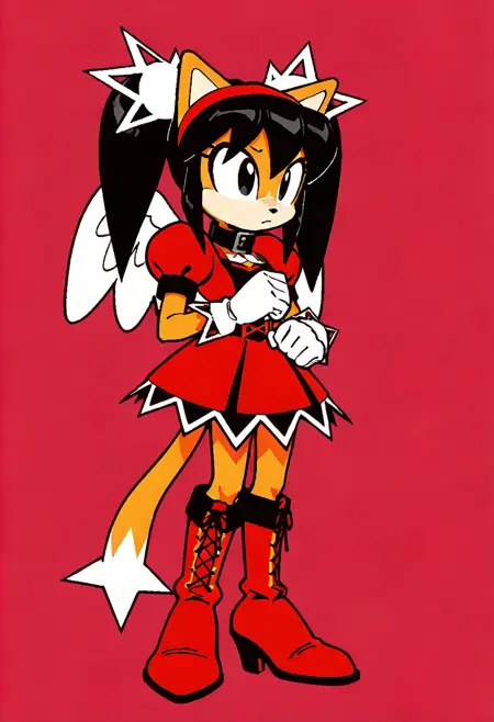 | トレーニングワード | H0ney, 1girl, anthropomorphic cat, light amber fur, peach muzzle, long black hair, voluminous pigtails, small black nose, large black eyes, red hairband, red dress, poofy shoulders, black collar, white angel wings, white gloves, red high-heeled boots, short, コピーしました! |