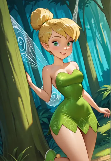 fairy, fairy wings, blonde hair, single hair bun, green dress, bare shoulders, strapless dress, short dress, short hair, green footwear, pointy ears, pompom shoes,