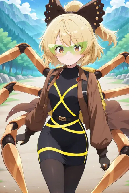 kurodani yamame, 1girl, solo, brown eyes, blonde hair, long hair, ponytail, small breasts, kurodani yamame \(envoy from the underworld\), alternate costume, hair bow, black bow, green-tinted eyewear, brown cape, brown jacket, open jacket, long sleeves, black shirt, black bodysuit, black gloves, black skirt, pencil skirt, black pantyhose, black shoes, yellow backpack, mechanical arms, arthropod limbs,
