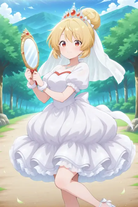 kurodani yamame, 1girl, solo, red eyes, blonde hair, hair bun,, alternate costume, alternate hairstyle, tiara, veil, white bow, wrist scrunchie, white dress, wedding dress, puffy short sleeves, high heels, white footwear, holding mirror,