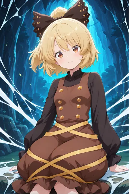 kurodani yamame, 1girl, solo, brown eyes, blonde hair, long hair, ponytail, small breasts,