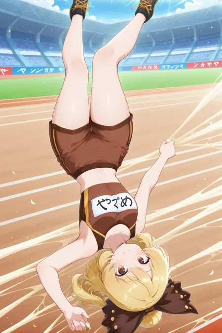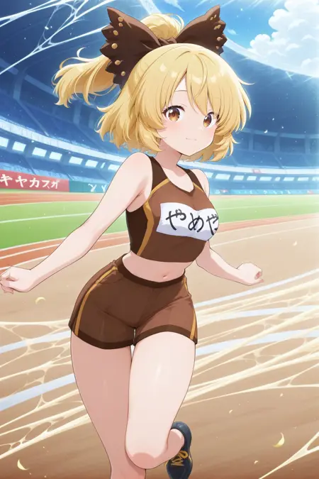 kurodani yamame, 1girl, solo, brown eyes, blonde hair, long hair, ponytail, small breasts, kurodani yamame \(worm moon earth spider\), alternate costume, hair bow, brown bow, brown shirt, sleeveless shirt, midriff, name tag, brown shorts, black shoes,