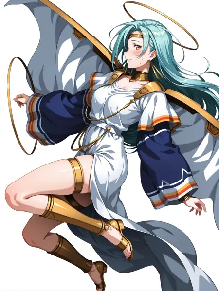 衣装ワード・l_clothes,dress,blue sleeves,jewelry,cape,gladiator sandals,