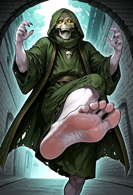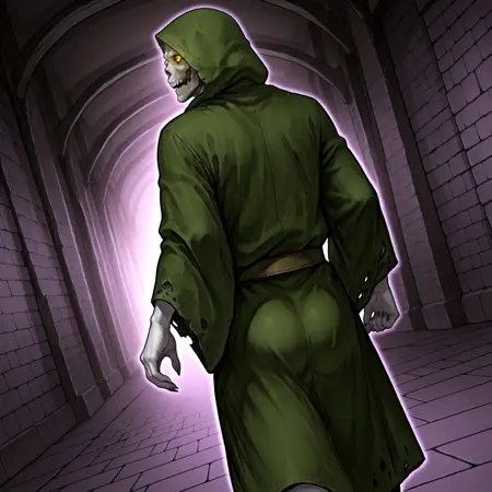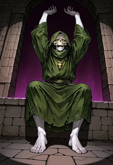 white skin, skull, teeth, green hood, golden necklace, torn robes, green skirt, glowing eyes, yellow eyes, deep eyes hole, long fingernails, no pupils,