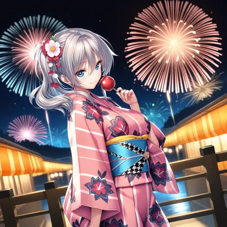 hair flower,side ponytail,long hair,sidelocks,japanese clothes,sash,floral print,pink kimono,wide sleeves,yukata,long sleeves,striped clothes,print kimono,blue obi,