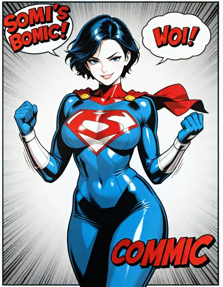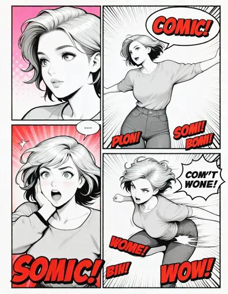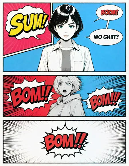 popcomic, western comics \(style\), halftone, partially colored,sound effects, speed lines,