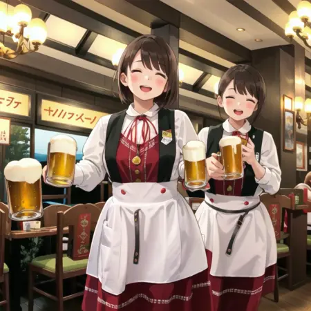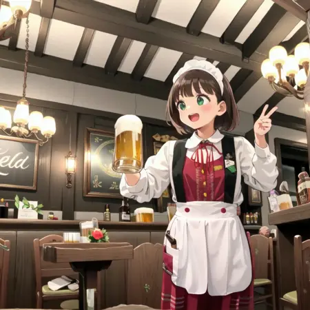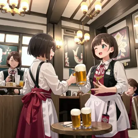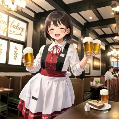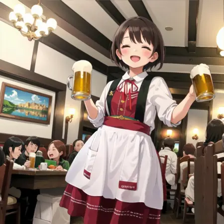 昭和33年、大阪・お初天神通りに創業した工場直送サッポロビールとオリジナル地ビール、阿波乙女鶏の唐揚げが人気の老舗ビアホール。関西の紳士たちの間で「あれかわいい」と評判の店員さんの制服、そしてかつて存在した曽根崎本店の店内風景を描き出せるかもしれないLoRAです。