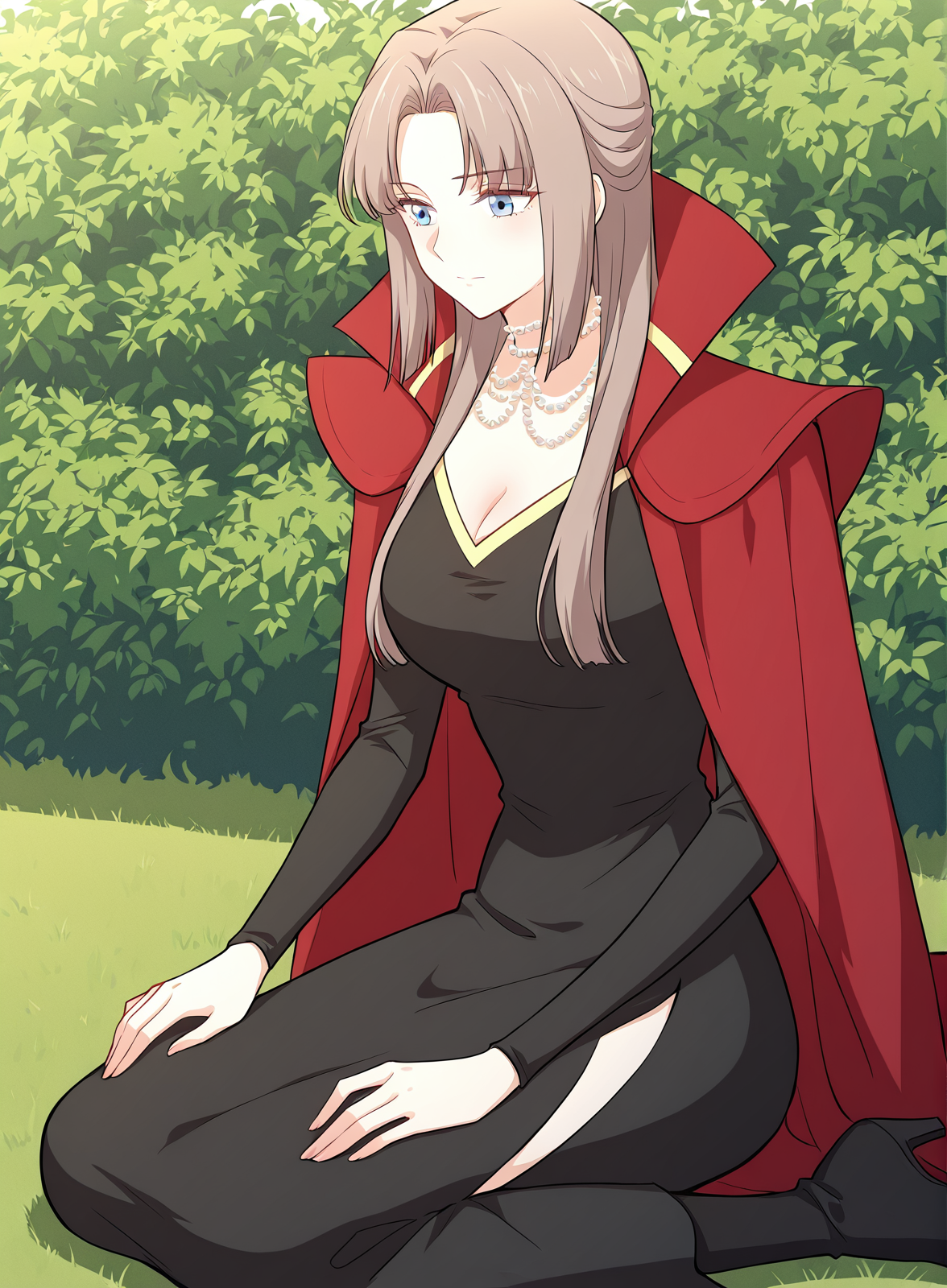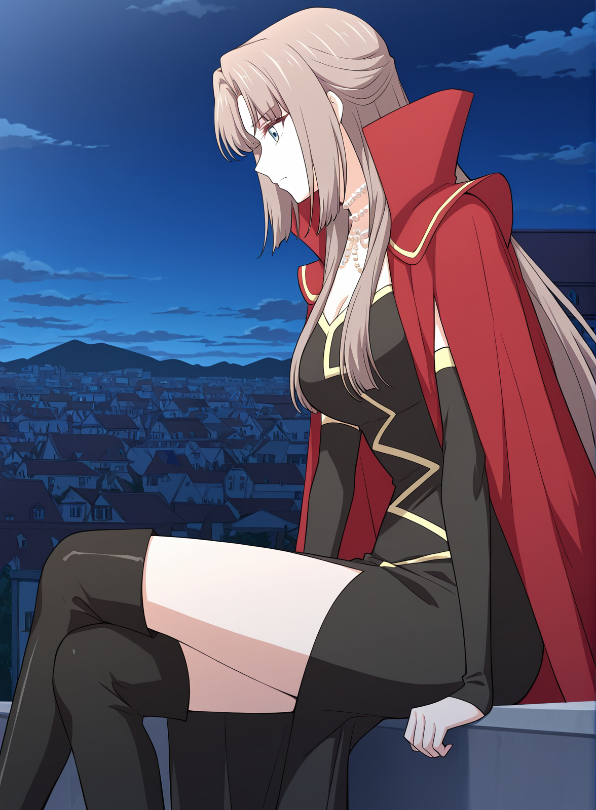elegant black dress, gold trim dress, high slit dress, form-fitting gown, red cape, wide collar cape, thigh-high black boots, layered pearl necklace,