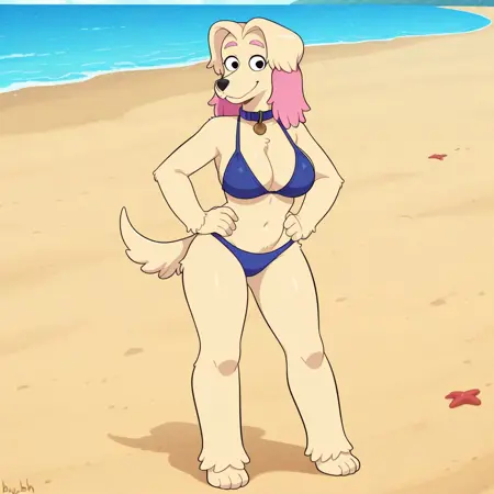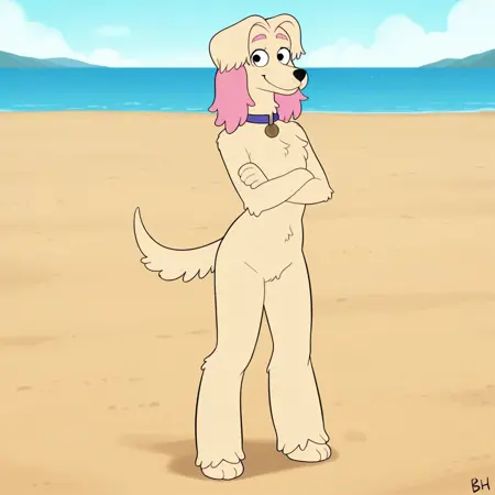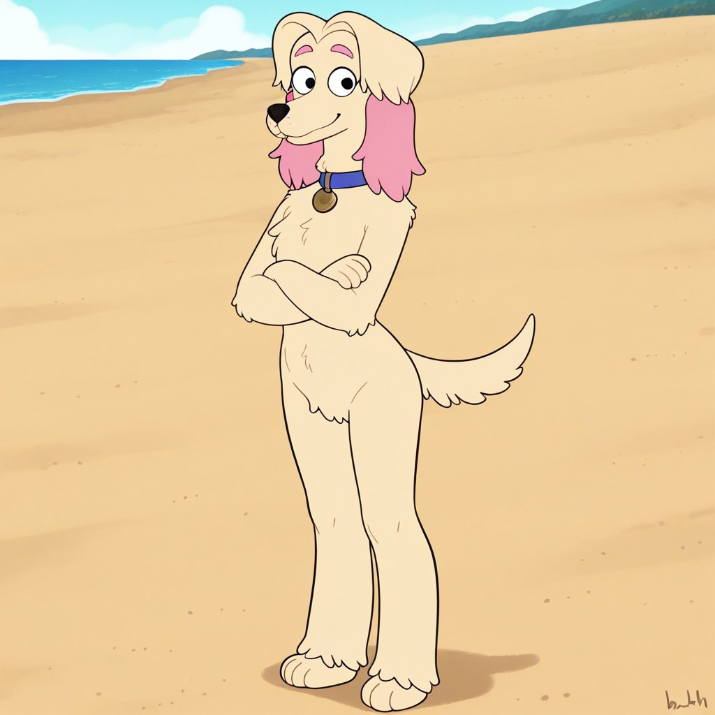 dog, afghan hound, tan fur, pink ears, dog ears, black nose, black eyes, pink eyebrows, blue collar, gold dog tag, dog tail,