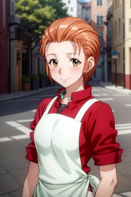 어떤 경우엔 앞치마가 나올 수 있는데, 이는 애니메이션의 대부분의 이미지가 이와 같이 나왔기 때문입니다(2011년 버전의 이미지만 사용됨). 그럼에도 불구하고, 태그에 가중치를 주지 않고도 다른 옷을 쉽게 입힐 수 있습니다.