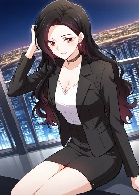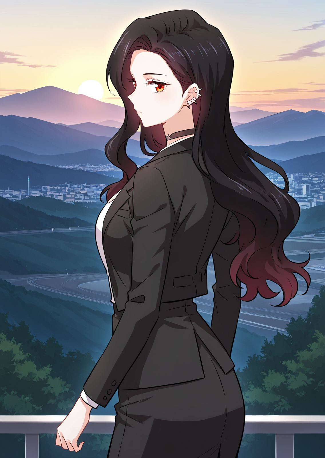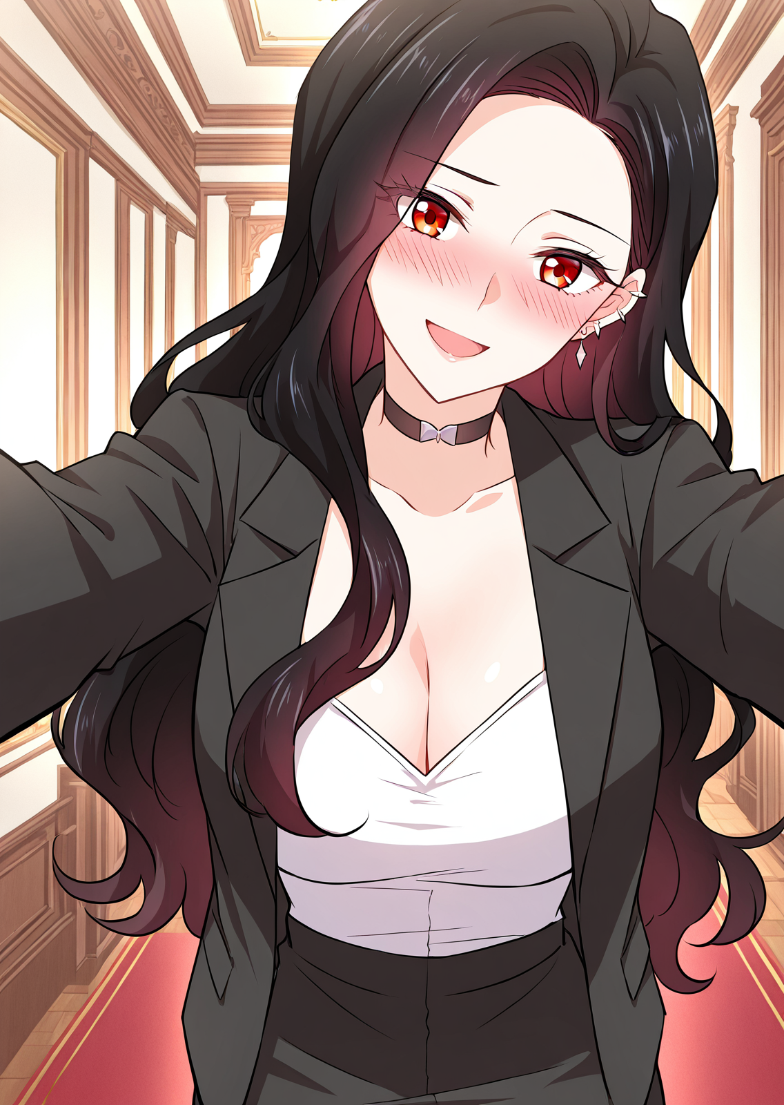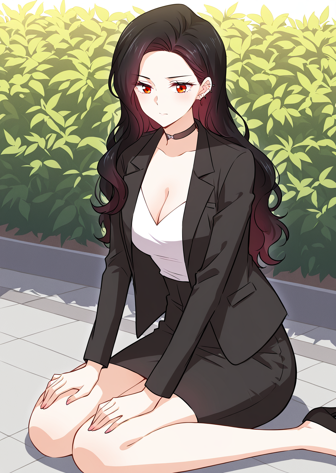 black suit, white low cut blouse, black pencil skirt, office outfit, black choker, formal attire, earrings, piercing,