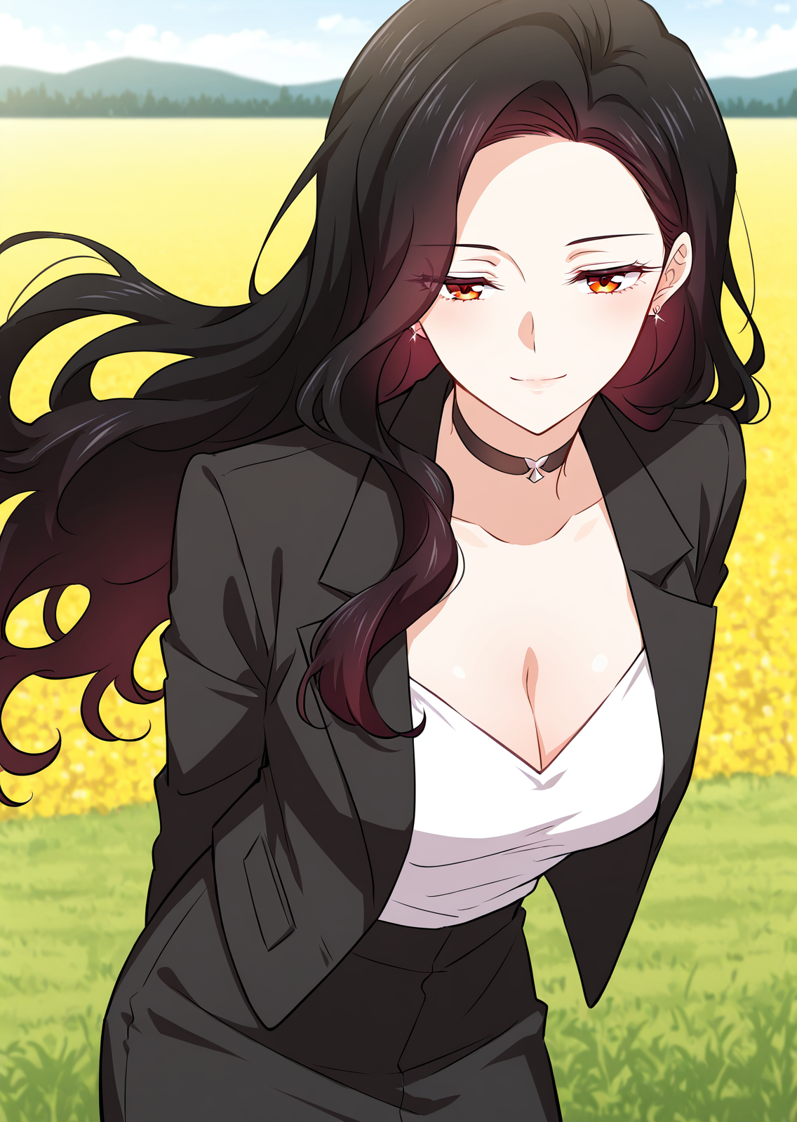 1 girl, solo, black hair, long hair, wavy hair, side part, red eyes,
