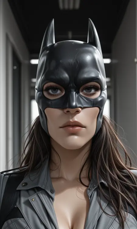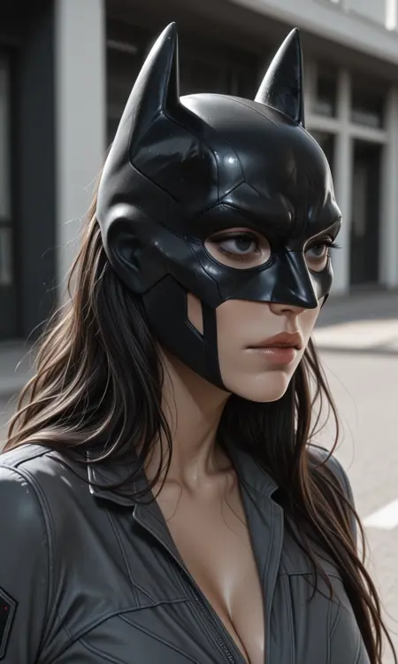 (1girl/very beautiful face, batwoman, batman mask, portrait, close-up to face, solo, grey uniform, full breasts, highlegs, long legs, Arrogant, lips, cleavage, long hair, mess hair), (eyes in the mask/realy eyes, Detailed eye, Eye detail, eye focus, black eyes, Unruly:1.2).