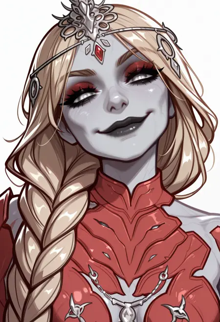 Character Tags: blonde hair, hair ornament, long hair, eyeshadow, white eyes, forehead jewel, black lips, colored skin, single braid, headpiece, circlet