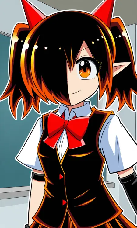 | Trained Words | jkblack,wide eyes,pointed ears,dark black and orange hair,hair_over_one_eye,multicolored_hair,twintails, black_hair,orange_eyesCopied! red bowtie,stylized school uniform,red bow,bowtie,shirt,pleated_skirt,black_skirt,short_sleeves,thighhighs,shoesCopied! |
