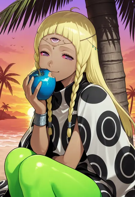 彼女のデフォルト衣装「3uph@」:金髪、ロングヘア、ストレートな前髪、ツインバレー、紫の目、第三の目、肌の黒い女性、頭飾り、額の宝石、ポンチョ、ポカドット、緑のタイツ、長袖、白いシャツ、ブレスレット