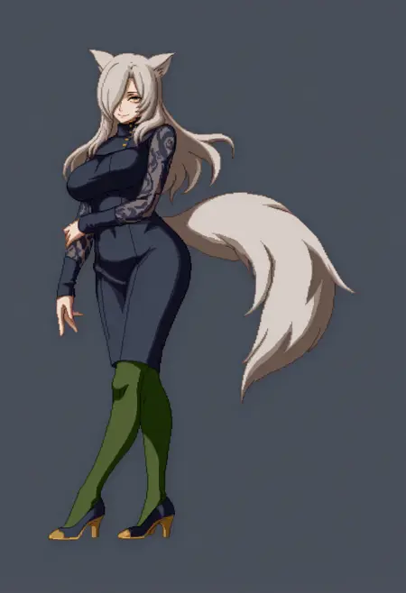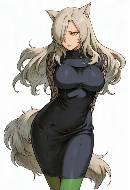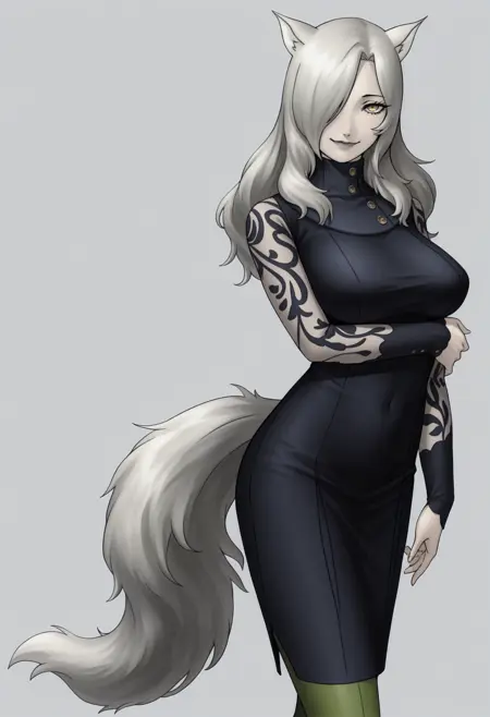 タグ:「灰色の髪、黄色い目、オオカミの尾、オオカミの耳、片目に髪を垂らす、タートルネックのドレス、レースの袖、黒いドレス、緑のパンティストッキング、大きな胸」