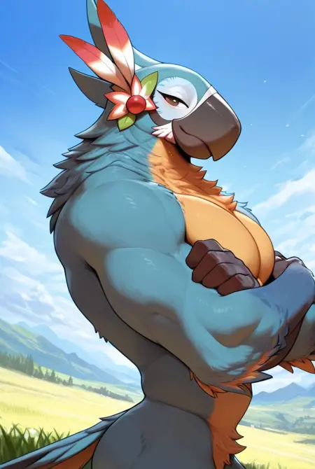 1boy, Kass, rito, muscular male, bara, large pectorals, feathers, bird tail, talons, feather hair ornament