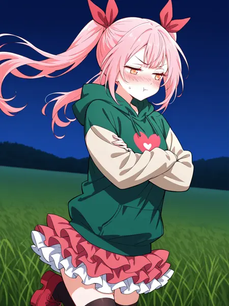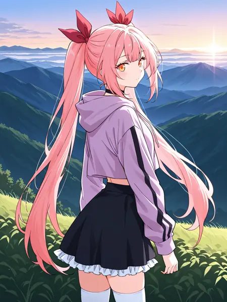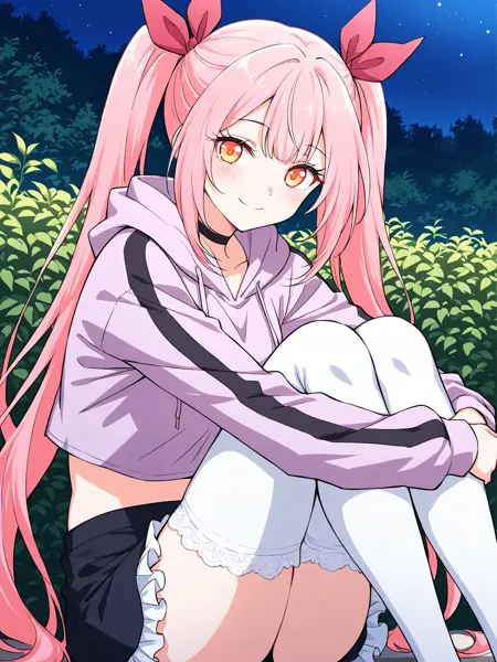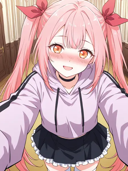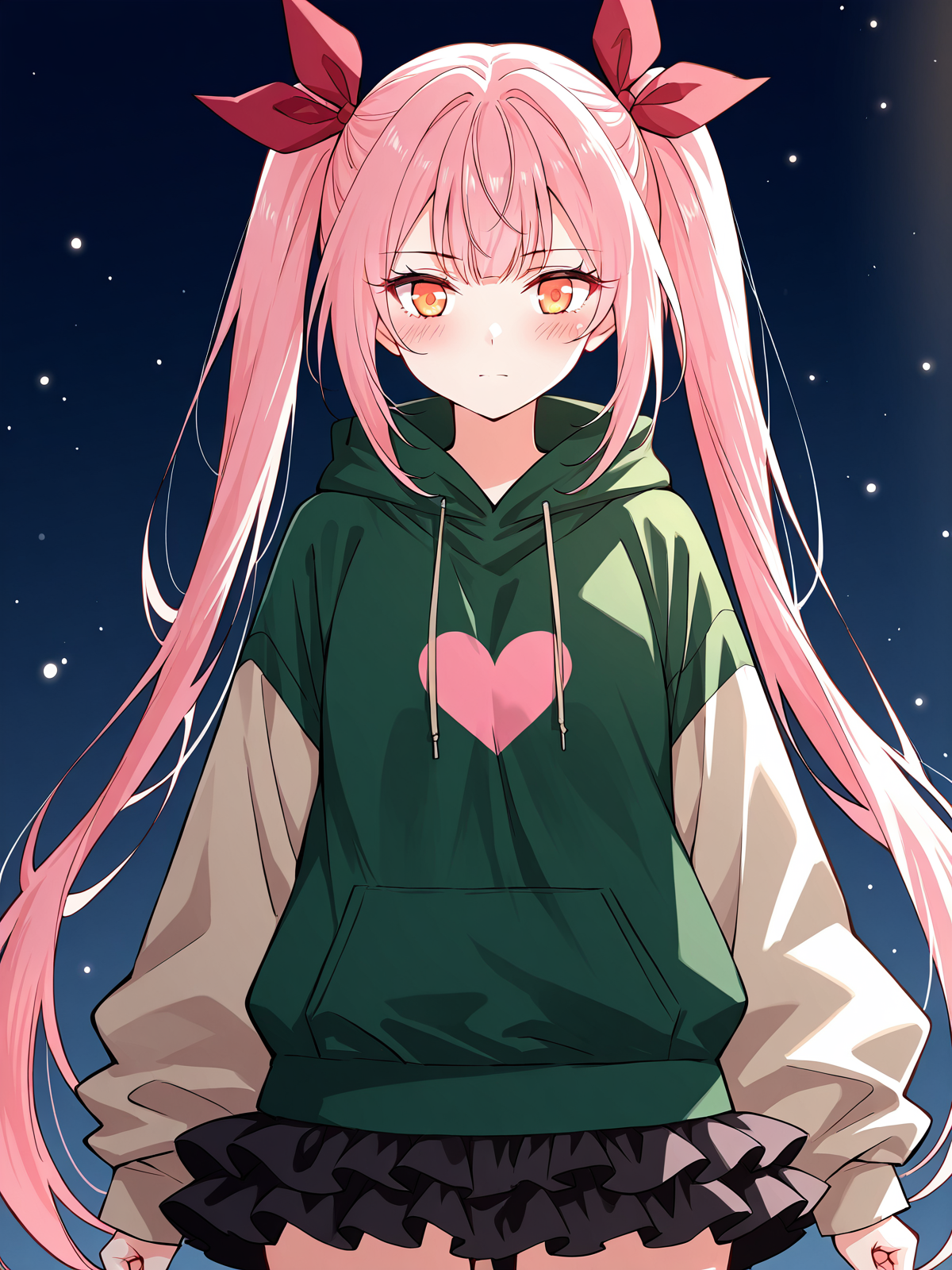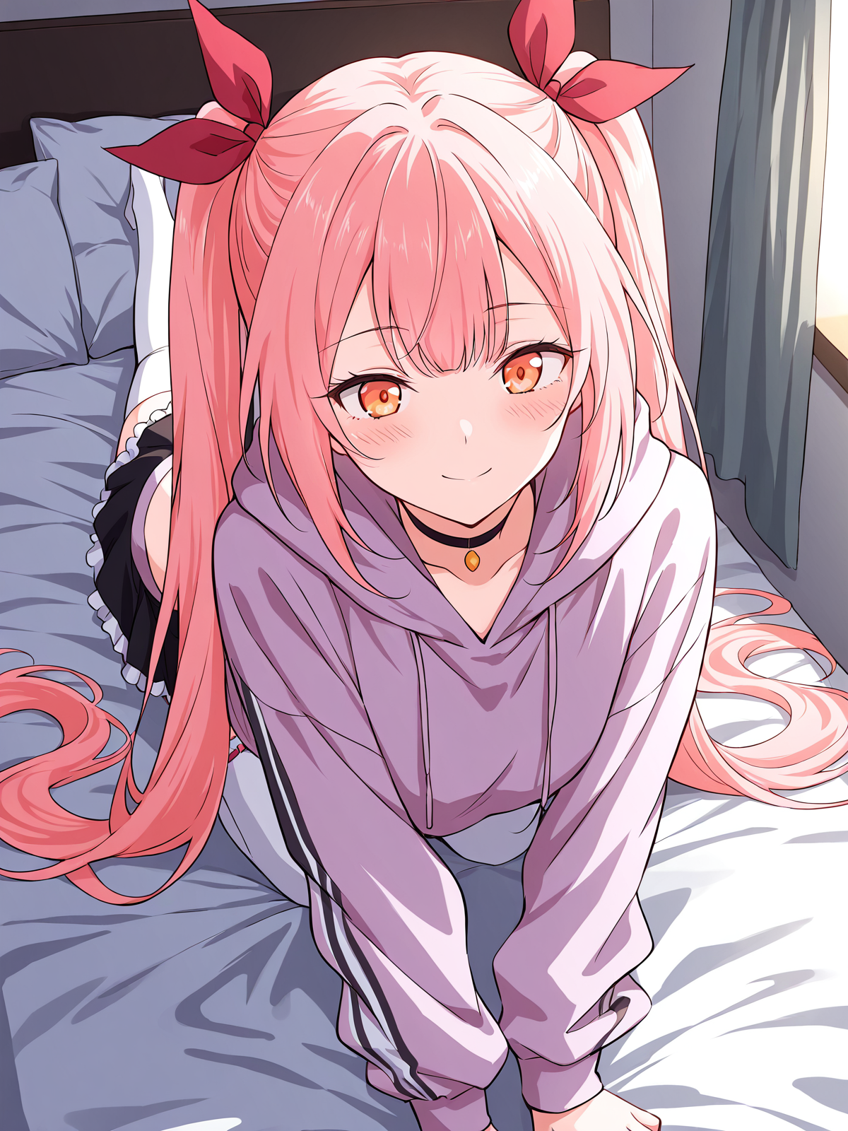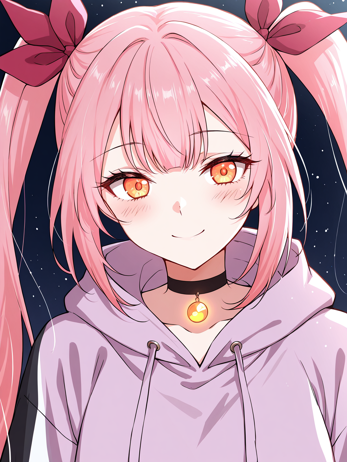 1 girl, solo, pink hair, long hair, twin tails, large bows, hair bow, orange eyes,
