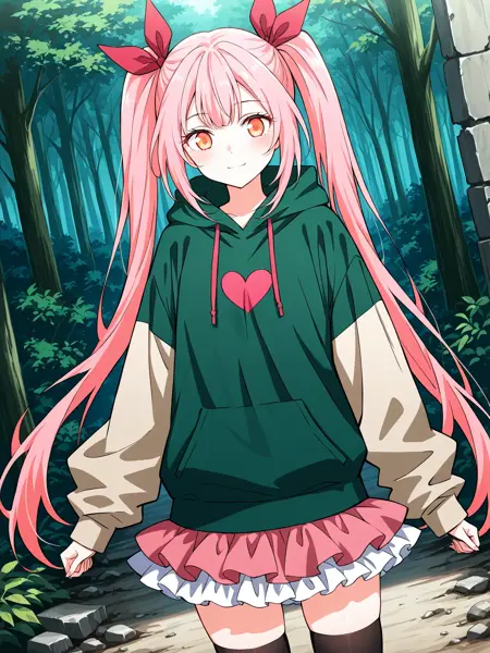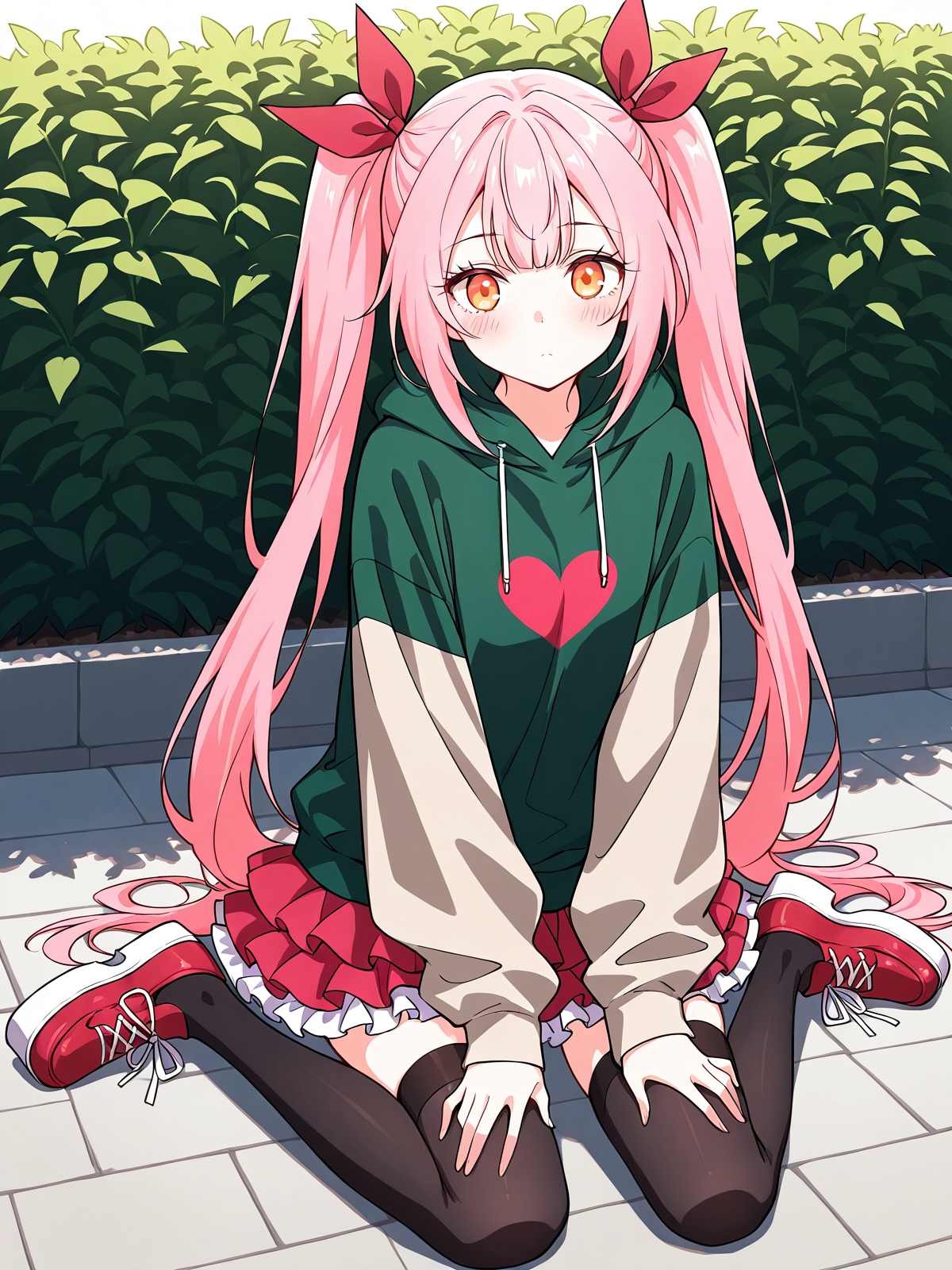 green hoodie, heart print, oversized sleeves, beige sleeves, pink frilled skirt, layered skirt, black thighhighs, white stripes, red shoes, platform shoes,
