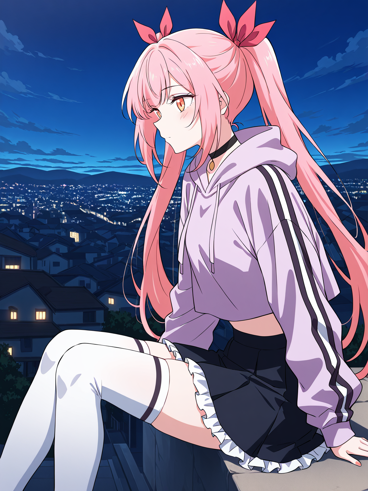 lilac hoodie, cropped hoodie, striped sleeves, black mini skirt, frilled hem, white frills, white thighhighs, choker,