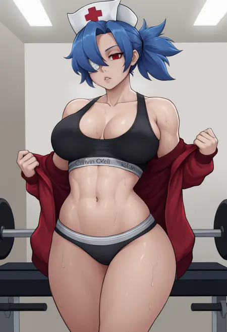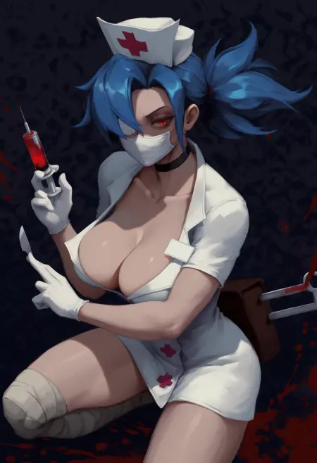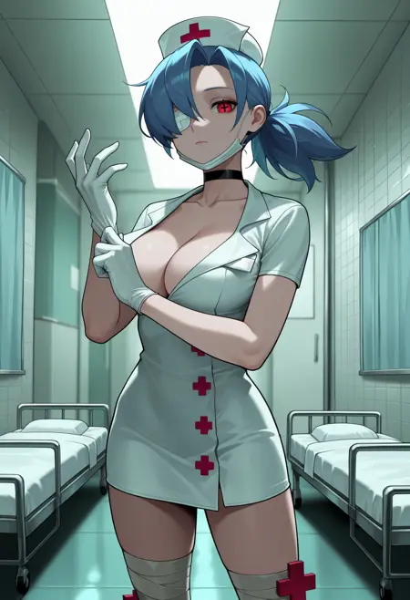 デフォルトの衣装: nurse cap, red cross, white mask, mouth mask, surgical mask, medical eyepatch, short dress, white dress, short sleeves, white gloves, bandaged leg, black choker, collarbone, cleavage