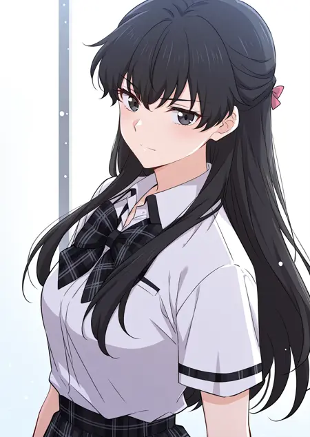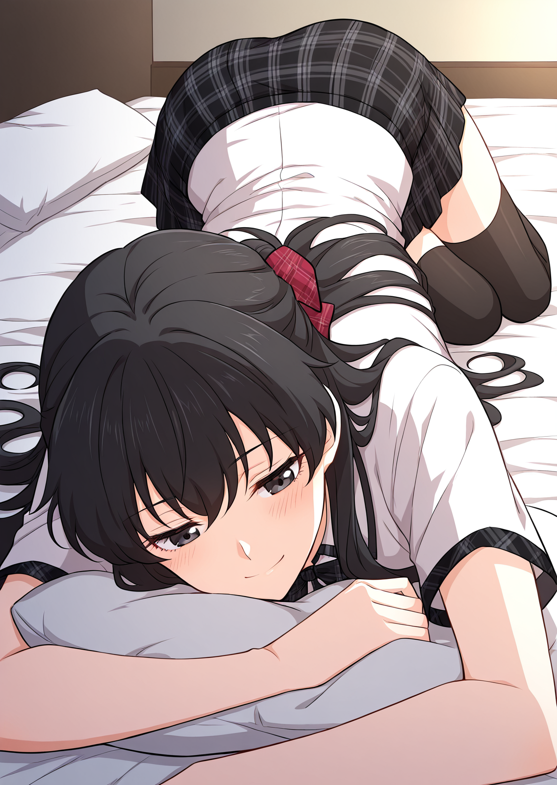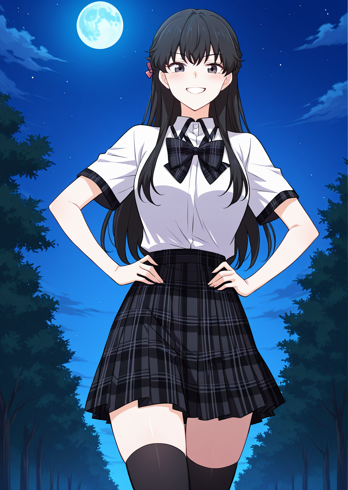 school uniform, short sleeve shirt, white shirt, plaid skirt, black plaid, big ribbon bow, thigh high socks,