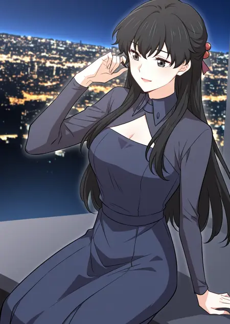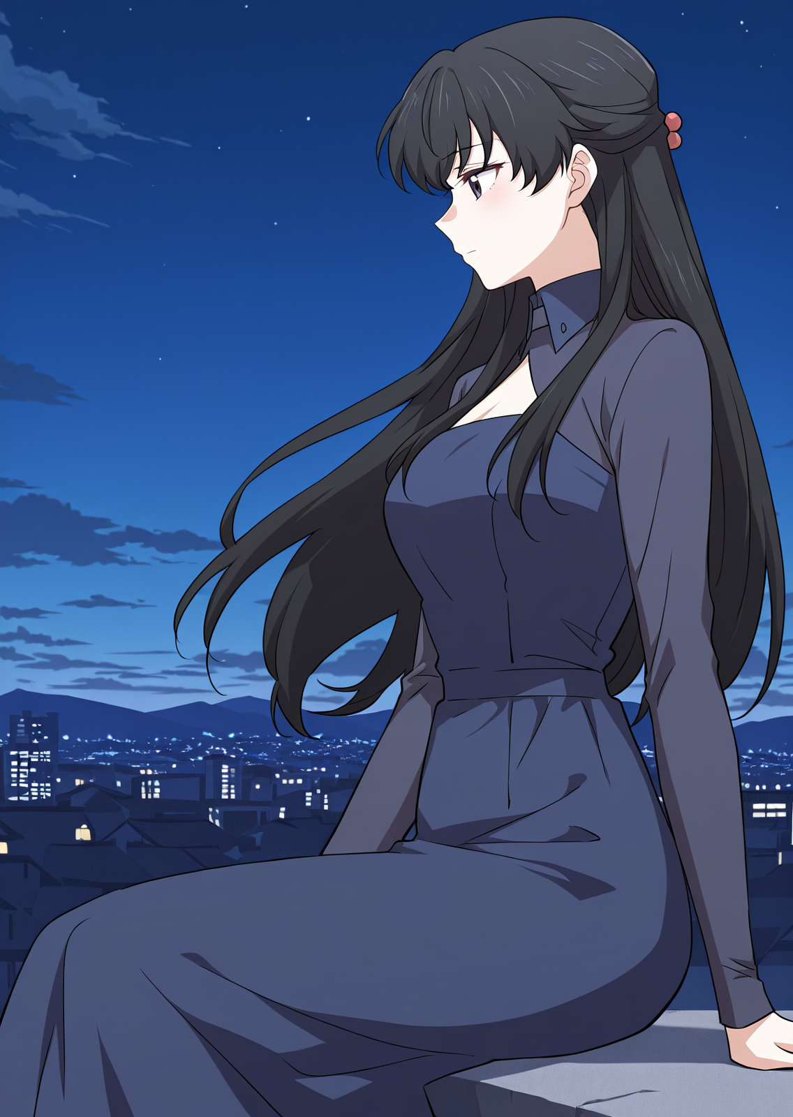 1 girl, solo,long black hair, straight hair, bangs, hair bun, black eyes,
