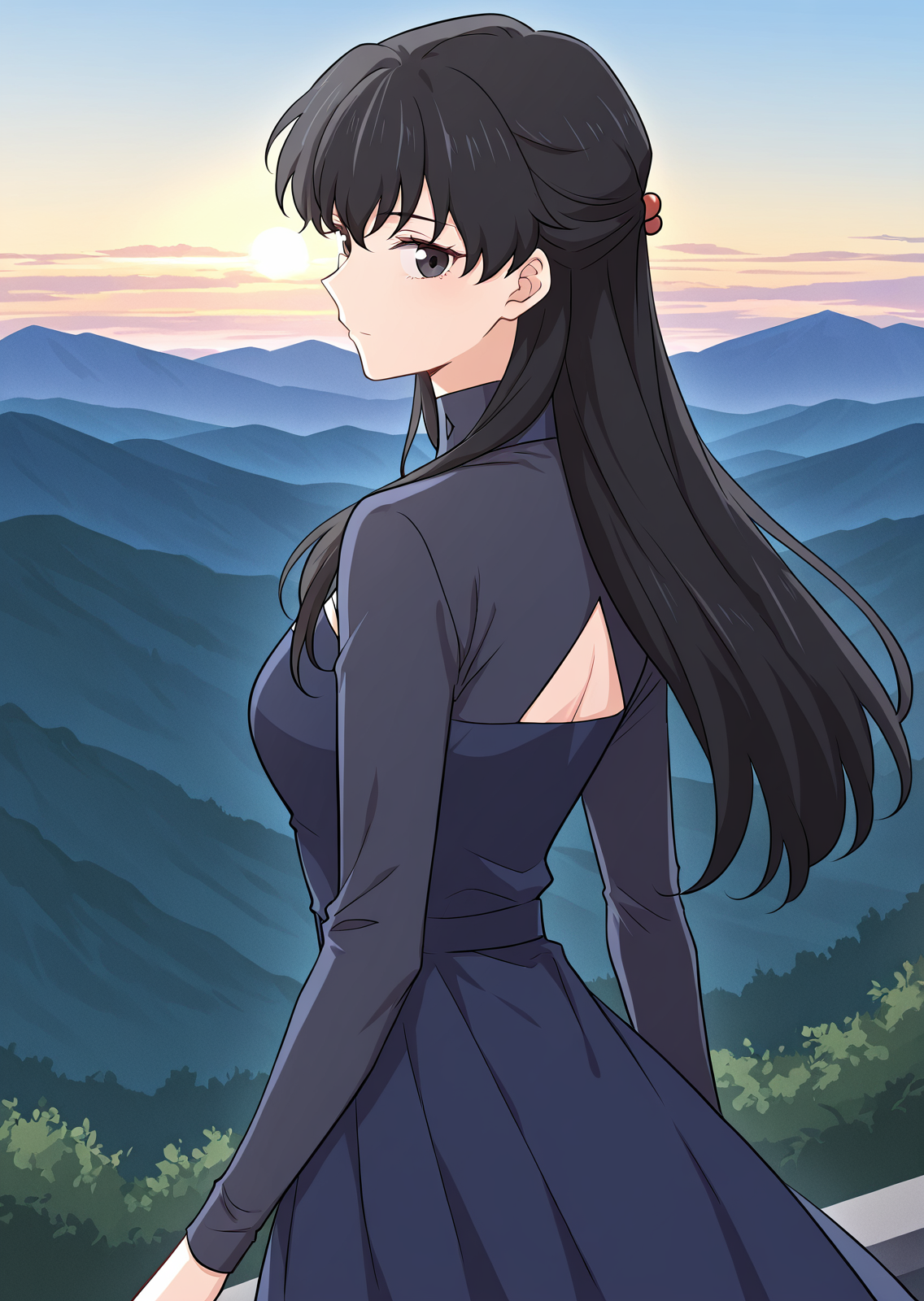 dark blue dress, long sleeves, high collar, triangular cutout, modest dress, feminine outfit, waist-length dress, fitted top, simple design,