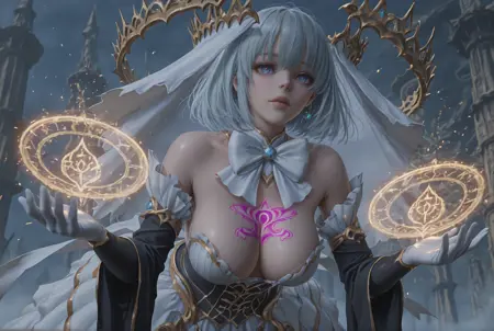 주 프롬프트: AngelBlender3, 1girl, 솔로, 파란 눈, 분리된 소매, 장갑, 활, 흰 드레스, 흰 활, 흰 장갑, 흰 신발, 베일, 흰 머리, 보석, 흰 바이어스, 금장식, 흰 스커트, 검은 소매, 중간 길이 머리, 벌거벗은 다리, 벌거벗은 어깨, 긴 소매, 옷 자르기, 프릴 드레스, 가슴 절개, 계층 드레스, 회색 머리, 코르셋, 윤기 나는 피부,