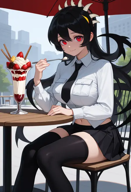 默认服装: 白衬衫,有领衬衫,胸袋,黑色领带,长袖,黑色裙子,百褶裙,超短裙,黑色过膝袜,肚脐