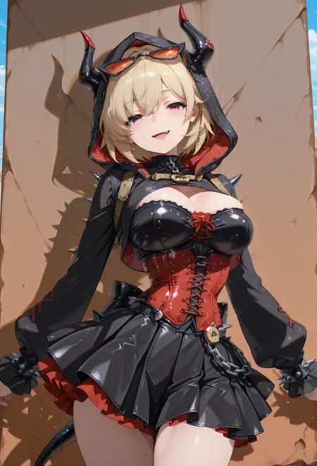 Outfit: pvc outfit, pvc corset, heart-shaped corset, chain accessory, pleated skirt, short skirt, layered skirt, tulle underskirt, long sleeves, hood up, spiked hood, tight clothing, small devil horns, horned hood