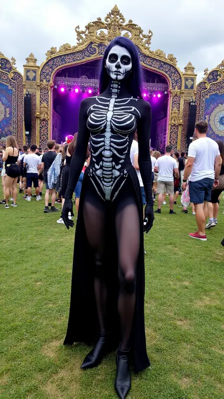 Trigger words: Outdoor music festival, intricate, ornate, elaborate stage, band, artist, dj, festival wear, art installation, crowd, large crowd, day, night, makeup, accessories, grass, dirt, mud, nature, neon, laser, lighting, fireworks, smoke, body suit, face paint, body paint, glitter, makeup, trippy, cosmic, ethereal, background, intense, raver, ravers, props, tent.