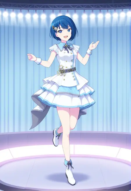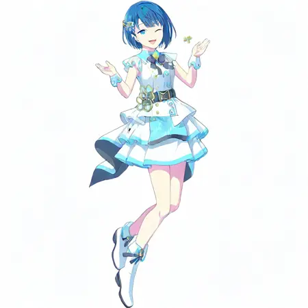 1girl, blue hair, blue eyes, short hair, hair ornament, boots, white footwear, dress, ankle boots, wrist cuffs, bangs, skirt, idol clothes