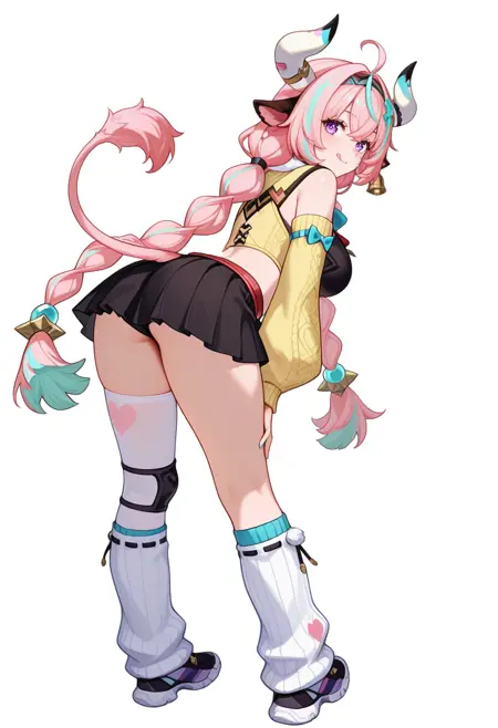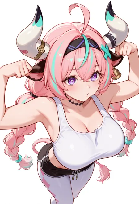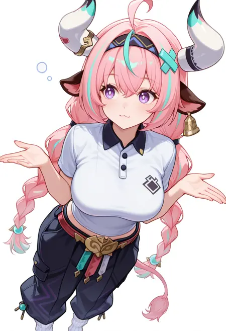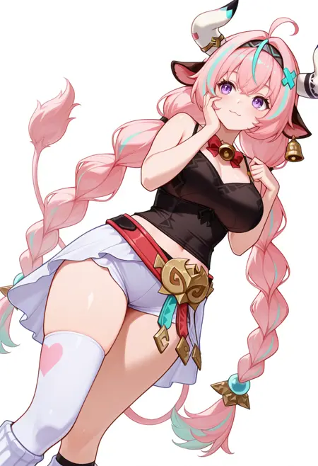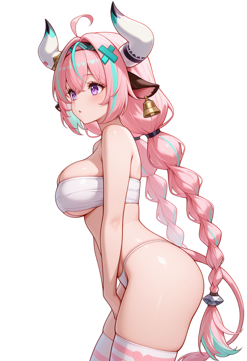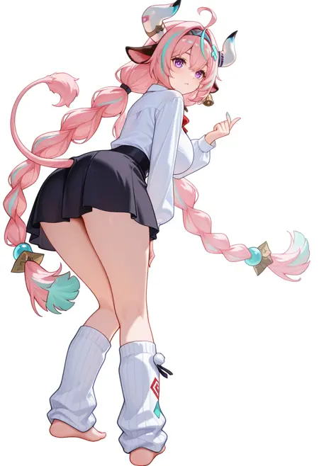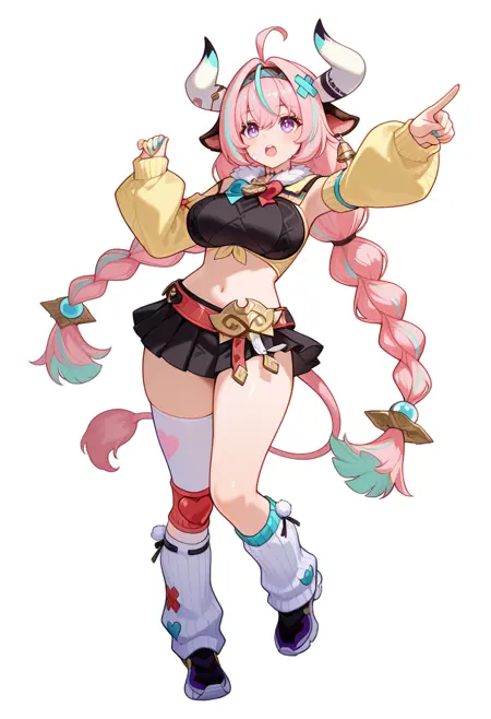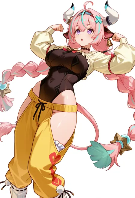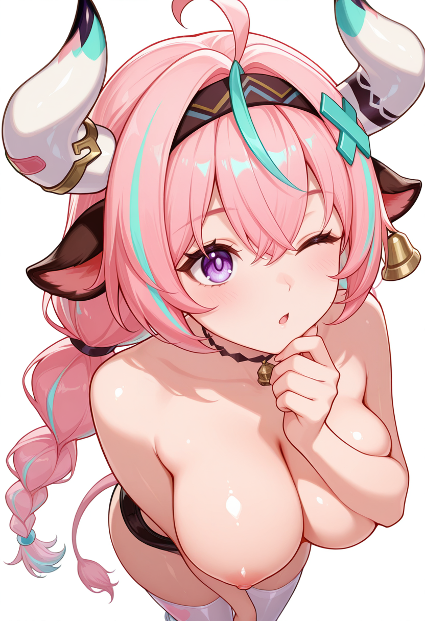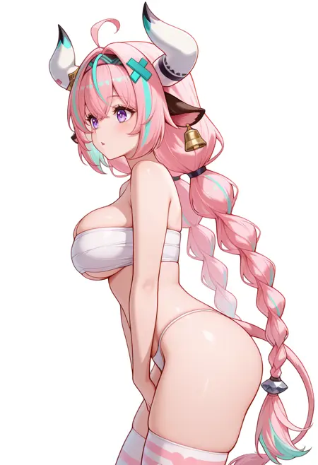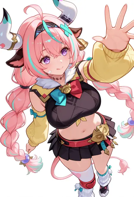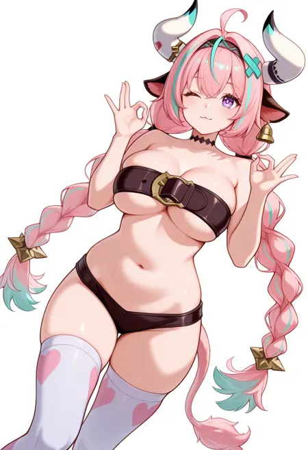 varesa_cnr, 1girl, 粉色头发, 蓝色头发, 水色头发, 发色渐变, 超长发, 双马尾, 天线发, 紫色眼睛, 牛仔女孩, 牛耳, 牛角, 牛尾, 大胸, 头饰, 发带, 项圈,