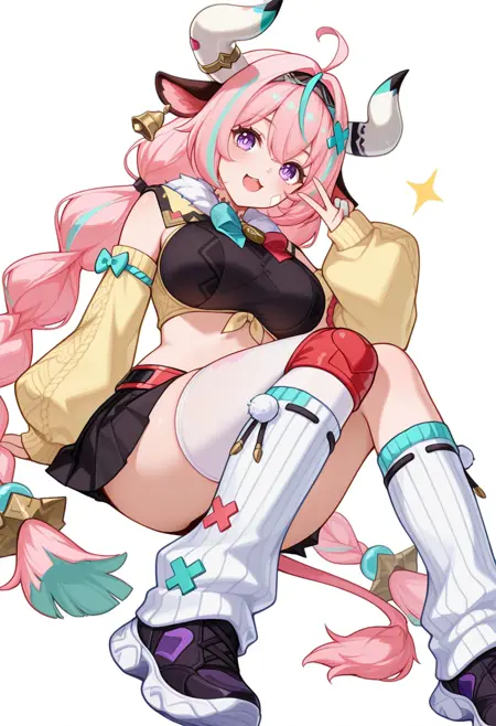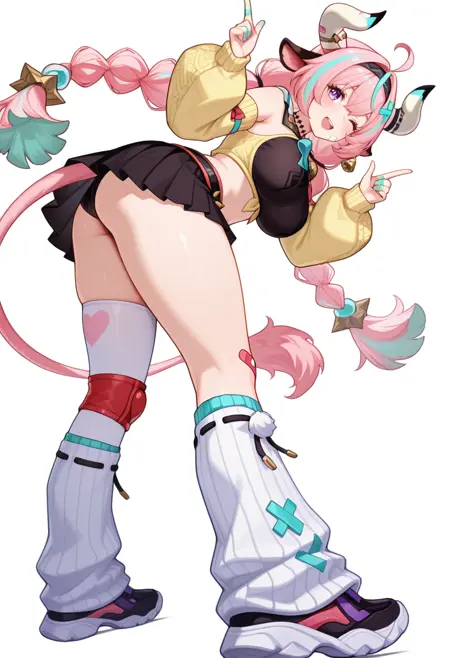 露脐, 创可贴, 短上衣, 黑色裙子, 超短裙, 百褶裙, 分离式袖子, 蓬松长袖, 白色过膝袜, 单侧过膝袜, 松垮袜子, 鞋子, 蓝色蝴蝶结, 腿套, 护膝,