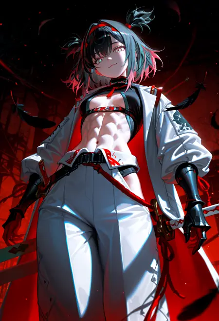 红色发带, 项圈, 白色外套, 蓬松长袖, 袖章, 外套敞开, 衣服敞开, 露肤装, 双乳分开, 黑色短上衣, 下胸显露, 中央开口, 露脐, 背部武器, 髋部开缝, 宽松长裤, 腰带, 白色长裤, 黑色腰带, 红色腰带, 红色飘带, 黑色护腕, 红色手套, 无趾鞋,