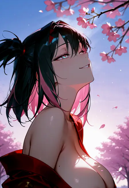 1girl, 苍白皮肤, 眼下有痣, 粉色眼睛, 水蓝色眼睛, 多色眼睛, 中等长度头发, 两侧高束, 刘海, 黑发, 染发, 双色发, 头饰, 发丝垂落, 侧发, 眉间头发, 小胸, 腹肌, 宽臀, 厚大腿,