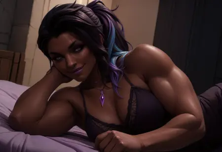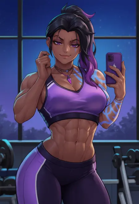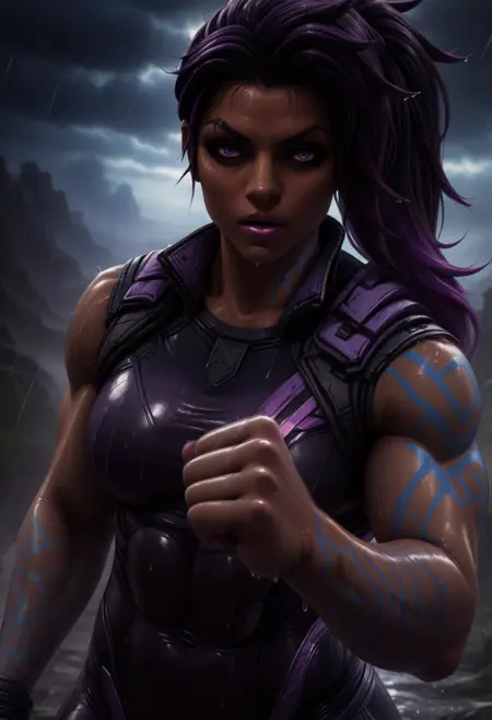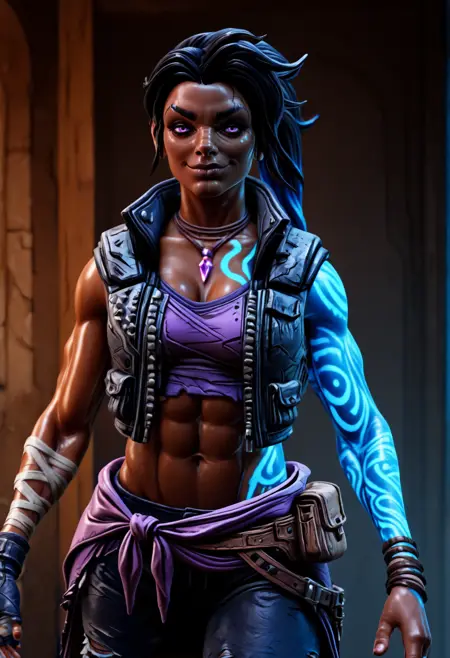 • Look Tags: dark-skinned female, multicolored hair, blue hair, black hair, long hair, ponytail, asymmetrical hair, eyebrow cut, purple eyes, arm tattoo, blue tattoo, toned, abs