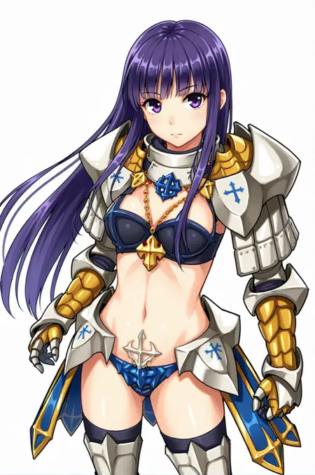 プロンプト:royalGRO, navel, bikini armor, midriff, gauntlets, necklace, shoulder armor, faulds, blue panties, breastplate, cross, black bra, greaves, thigh boots, high heel
