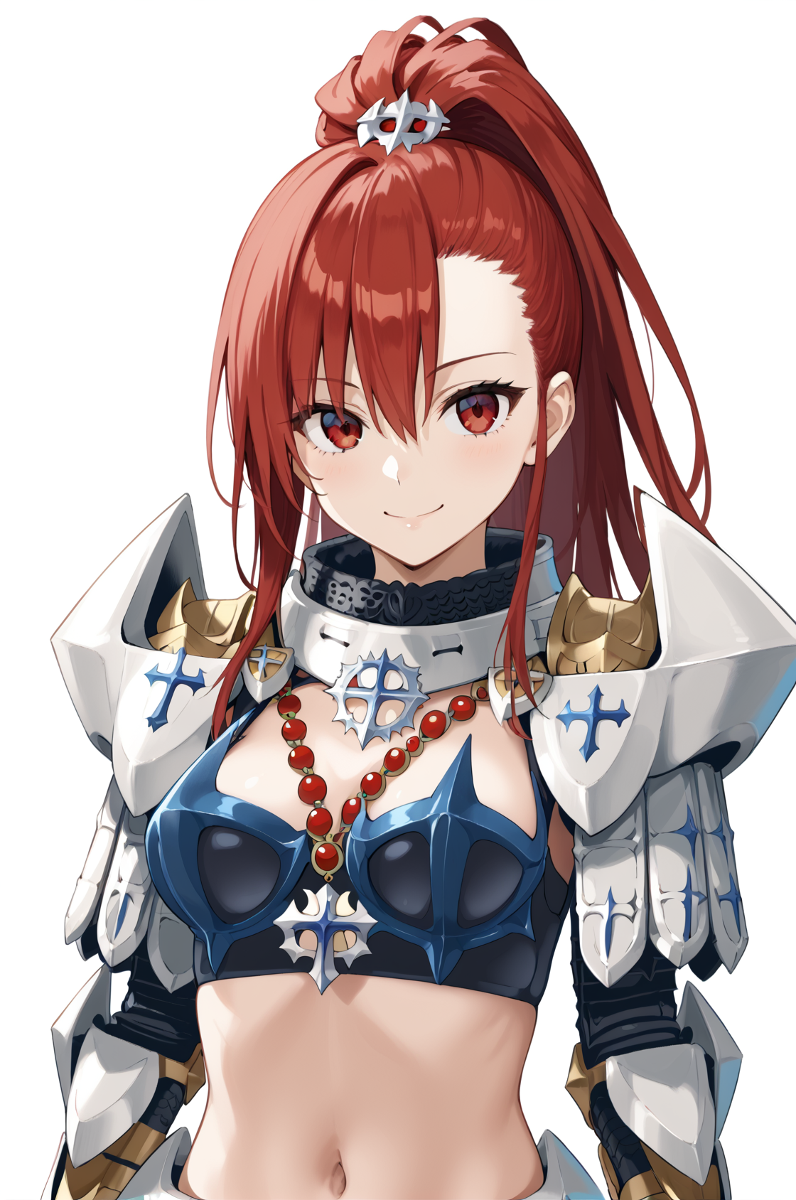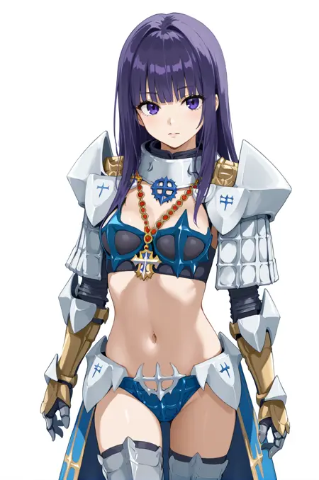 royalGRO, navel, bikini armor, midriff, gauntlets, necklace, shoulder armor, faulds, blue panties, breastplate, cross, black bra, greaves, thigh boots, high heel