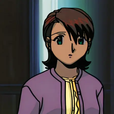 ghost stories, gakkou no kaidan, kayako miyanoshita, woman, female, mature female, reddish-brown hair, green eyes, purple jacket, yellow dress