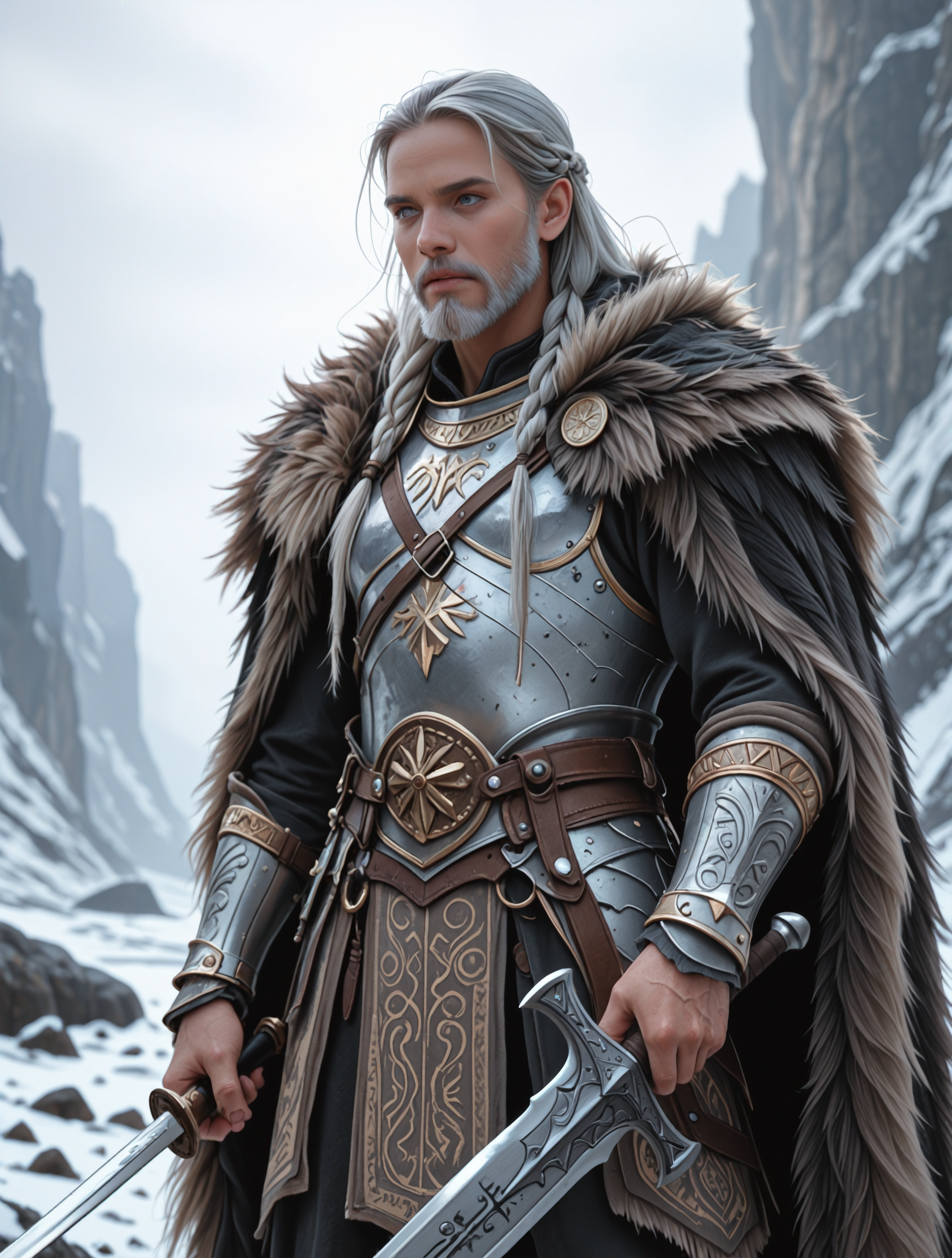 - nordicbynature, shieldmaiden, sword, snowy mountains, cloudy sky
