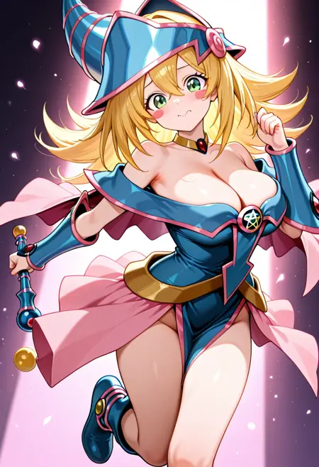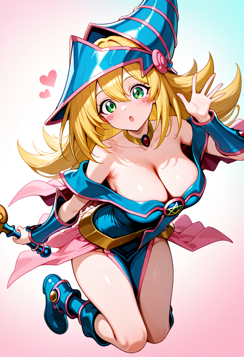dmg_ygo,1girl,solo,duel monster,blonde hair,long hair,green eyes,bare shoulders,pentacle,wizard hat,pelvic curtain,choker,boots,blue footwear,blush stickers,large breasts,cleavage,